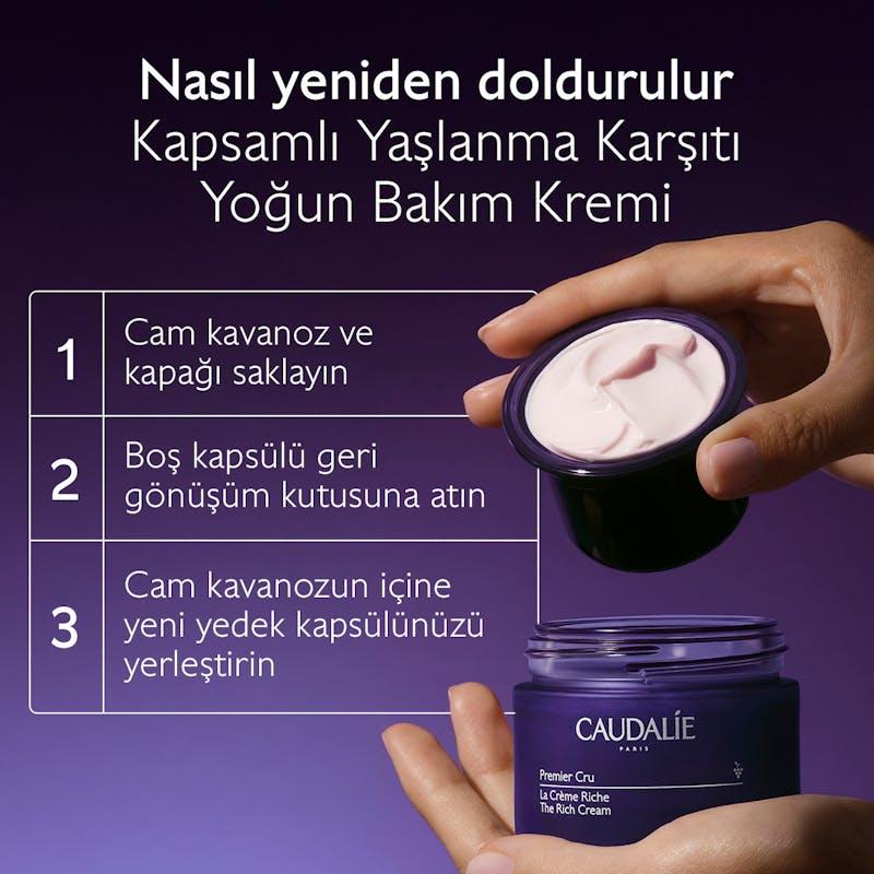 Sabah ve akşam serumunuzdan sonraKeşfet Caudalie güzellik ve eko-sorumluluğu bir araya getiriyor. Kapsüller, Premier Cru Kapsamlı Yaşlanma Karşıtı Gündüz Bakım Kremi kavanozunu kolayca yeniden doldurmanızı sağlar. Yedek kapsüller, kapağa sahip değildir, bu sebeple tek başlarına kullanılamazlar. Yalnızca yeniden doldurulabilir kavanozla birlikte kullanılmak üzere tasarlanmışlardır.