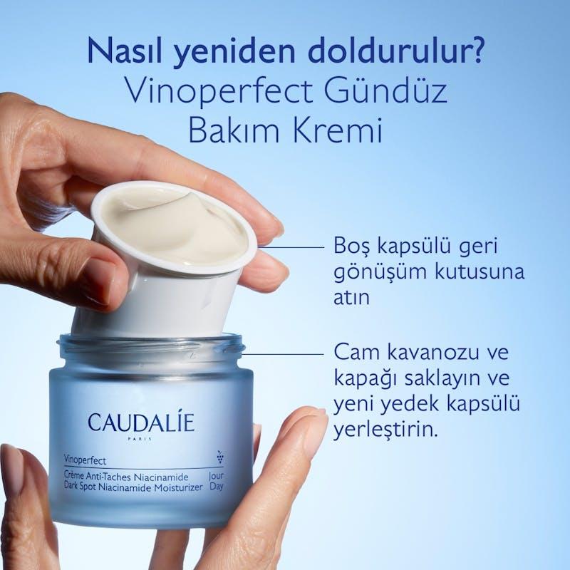 Sürdürülebilirlik Taahhüdü Vinoperfect Anında Işıltı Veren Gündüz Bakım Kremi ile Leke Karşıtı Glikolik Gece Bakım Kremi'nin kavanozları, yedek kapsüller sayesinde kolayca yeniden doldurulabilir. Ekolojik ve çevreye saygılı kapsül sistemi, yedek kapsül alışverişlerinde %85 daha az ambalaj tüketimine* karşılık gelir.