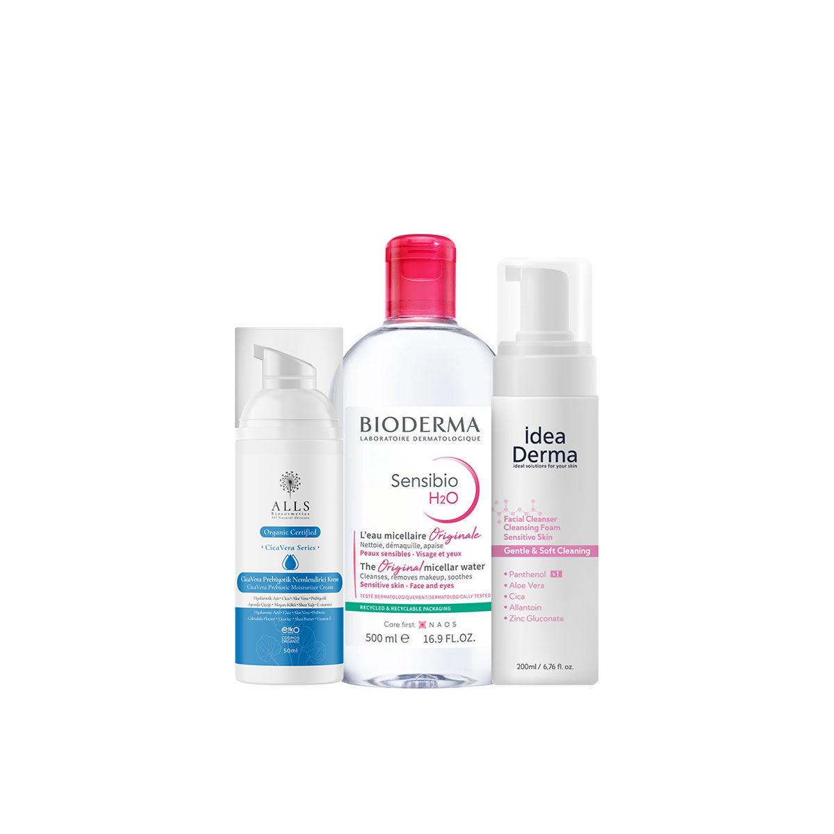 Bioderma Sensibio H2O Yüz ve Makyaj Temizleme Suyu 500 ml--İdea Derma Hassas Cilt Yüz Temizleme Köpüğü 200 ml--Alls Biocosmetics CicaVera Prebiyotik Nemlendirici Krem 50 ml