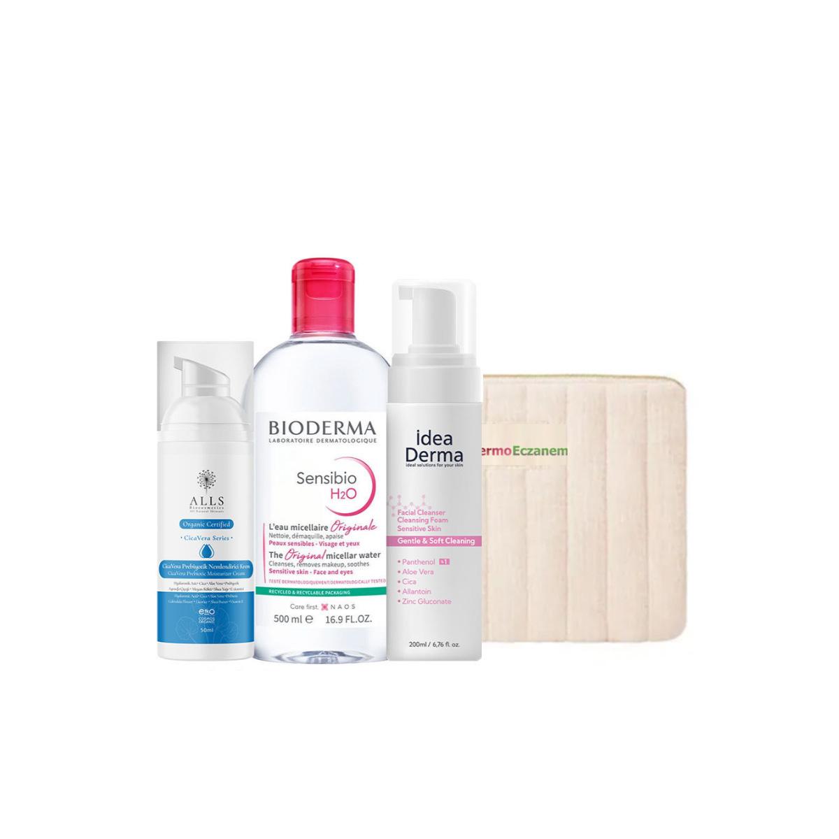 Bioderma Sensibio H2O Yüz ve Makyaj Temizleme Suyu 500 mlİdea Derma Hassas Cilt Yüz Temizleme Köpüğü 200 ml Alls Biocosmetics Cica Vera Prebiyotik Nemlendirici Krem 50 ml Çanta Hediyeli !