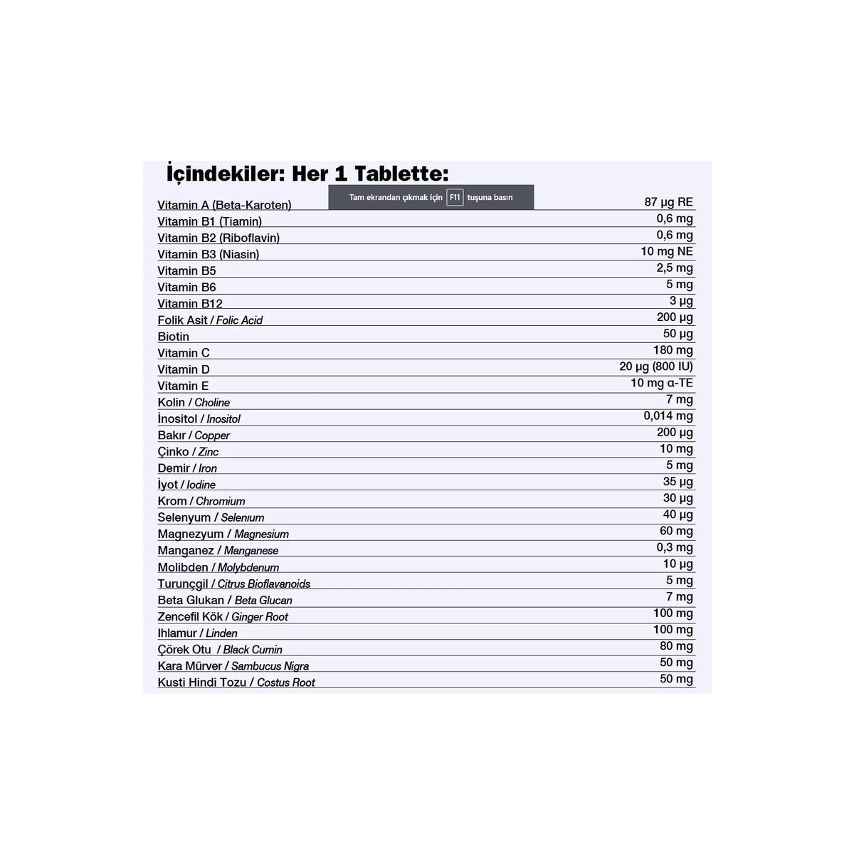 Yetişkinler için takviye edici gıda olarak günde 1 tabletin bol su ile kullanılması önerilir. Ürün Bileşimi:
