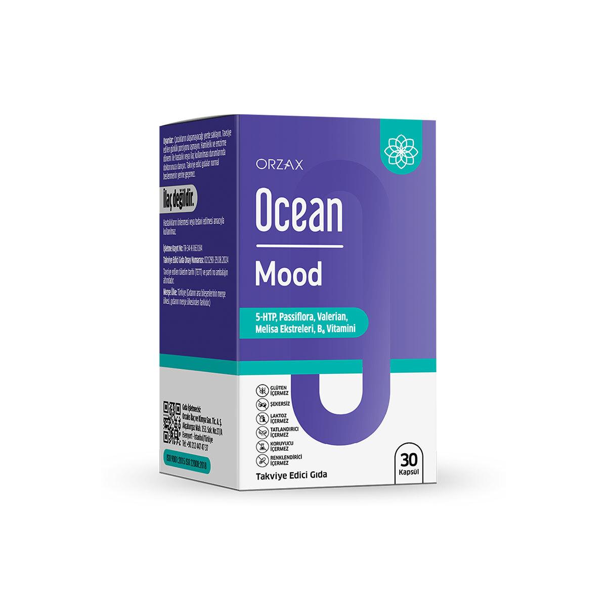 Ocean Mood 5-HTP, Passiflora, Valerian, Melisa ekstreleri ve B6 Vitamini içeren, kapsül formda bir gıda takviyesidir.